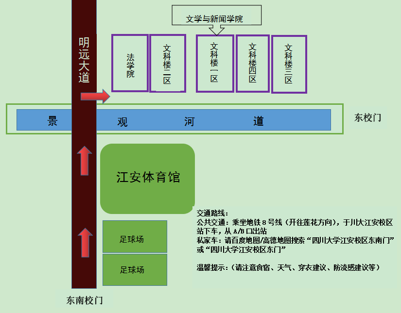 校外考生可乘坐成都地铁8号线在川大江安校区站下车,从A口或B口出站,到达樱花文学