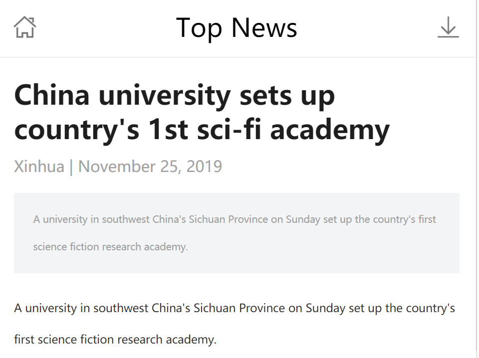 深度参与、组织和举办和各项活动,在海内外引起了较大反响。国内外诸多学者和从业人士不吝赞美称贺。11月25日,新华社刊发“中国科幻研究院”成立的英文消息,迅速被美国MSN,巴基斯坦国家报等网站和媒体转发、推送,并成为海外某著名社交平台当天点击量最高的前五条新闻之一。