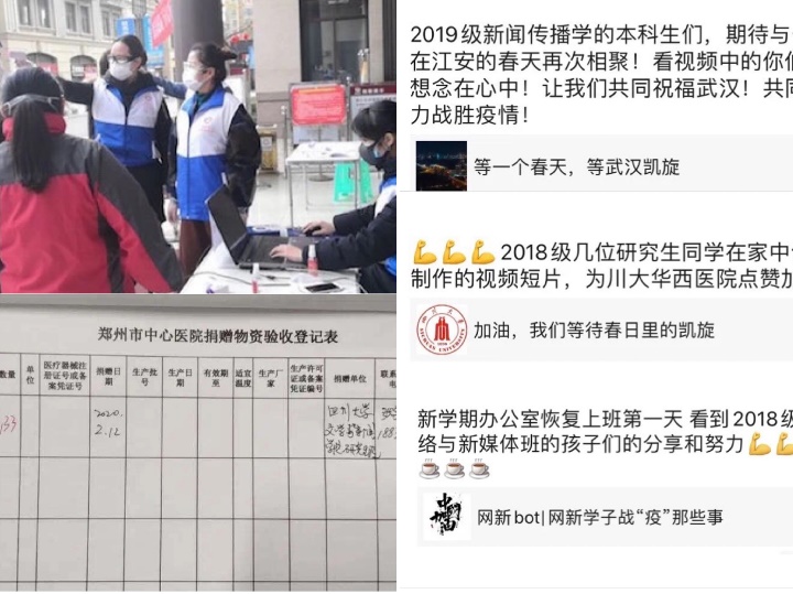 不少同学通过多种方式,志愿参与抗疫服务,传递温暖。2019级100余名硕士研究生自发筹款,为前线医务工作者募集133副护目镜,由张宇轩为前线医务工作者送去护目镜。2017级新闻学专业本科生张恩铭同学主动报名家乡发起的“关爱抗疫医护人员子女志愿辅导团”,为一位父亲正奋战在南充抗疫一线的高三男孩进行线上学习辅导,主动关心对方情况。2017级网络与新媒体专业本科生王小翠报名参与“雷火救援志愿者”,协助打通救援的信息通道。