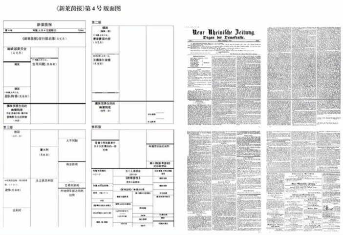 1959年,我国出版了《新莱茵报》影印合订本(对开两大本,近1700版,其中缺第113号和二十几期非正刊,发行158套)。由于当时德语人才缺乏,《新莱茵报》的文字全部是哥特体字,中国熟悉这种古老字体的人更少。《马克思恩格斯全集》中文第一版是根据俄译文转译的,其他十分之九的报纸内容没有人看过。60年来,所有关于《新莱茵报》的文章不断重复使用诸如“革命纲领的宣传者”“人民革命的指挥部”“孜孜不倦的揭露者”“来之不易的阵地”“永远飘扬的旗帜”等等标题,讲述老得不能再老的革命故事,但基本不是新闻专业的故事。因而,深化研究《新莱茵报》的第一步,应该是提供完整的《新莱茵报》中译文原版,并还原完整的版面语言。