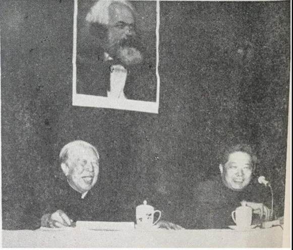 1983年3月10日张友渔、安岗在“纪念马克思逝世100周年新闻学术讨论会”主席台上