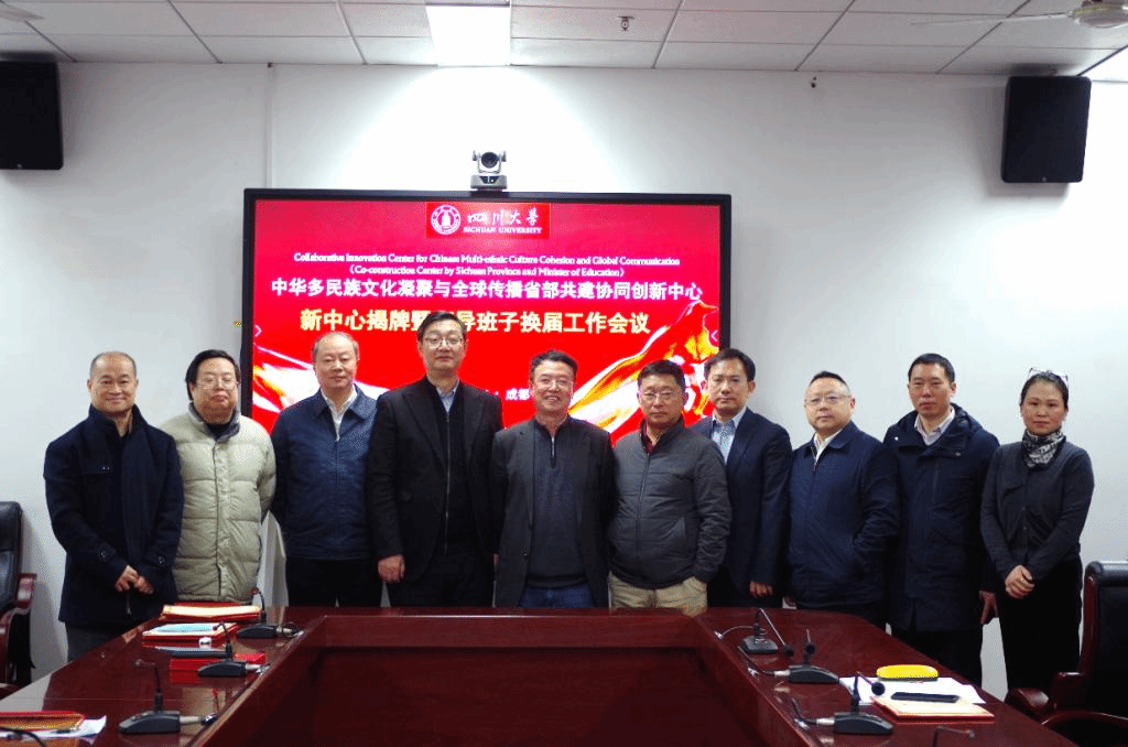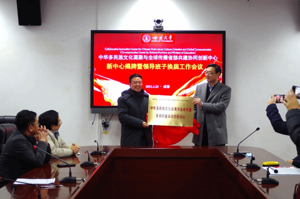 牵头组建的“中华多民族文化凝聚与全球传播省部共建协同创新中心”获教育部认定,成为四川省第一个文科省部共建协同创新中心。2021年1月23日上午,为在新的一轮建设期中进一步强化牵头高校的主体责任,成功获批的新中心揭牌仪式暨领导班子换届工作会议于江安校区文科楼一区418会议室顺利举行。