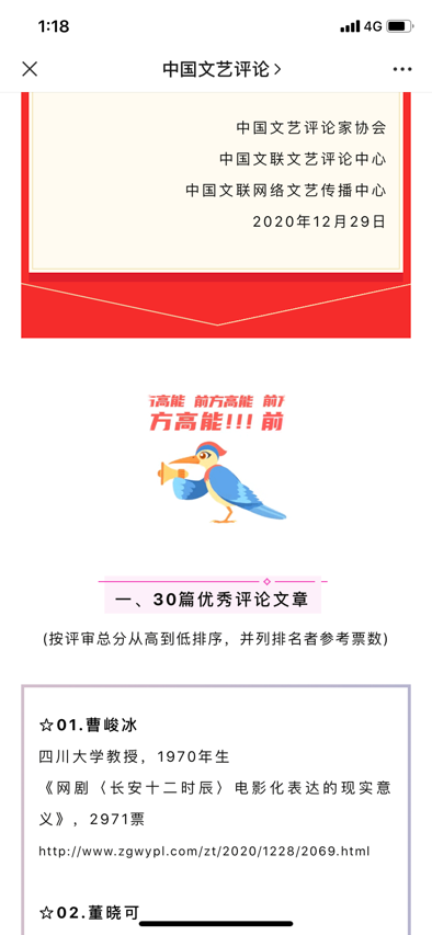 曹峻冰教授的文艺评论文章《网剧<长安十二时辰>电影化表达的现实意义》入选30名优秀评论文章,且评审总分排名第一,并受邀视频出镜。