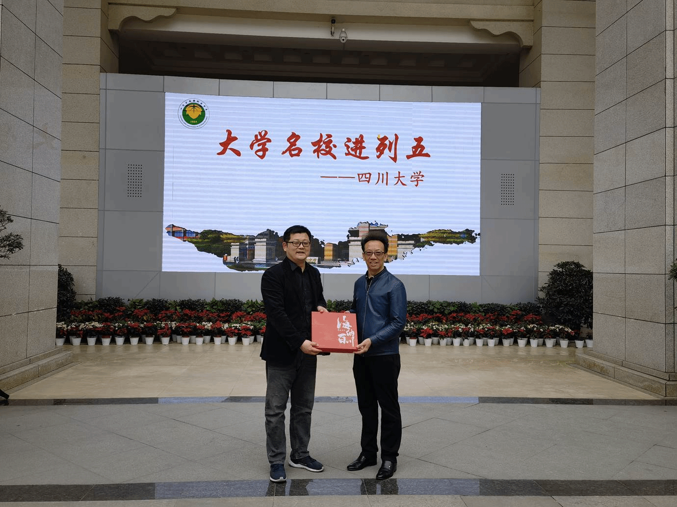 列五中学招生宣传组组长周维东教授代表学校,向列五中学校长吴光平赠送了礼物。
