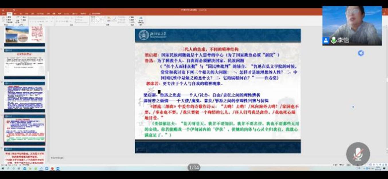 院长李怡教授带来“日本体验与郭沫若诗歌的意象嬗变——以‘海洋’、‘松’、‘梅’为例”的主题讲座,从比较文学的方向探讨研究了日本文学,讲述了鲁迅、郭沫若在日的文学经历等。同学们通过线上直播“云”学习,开拓了自己的文学视野。