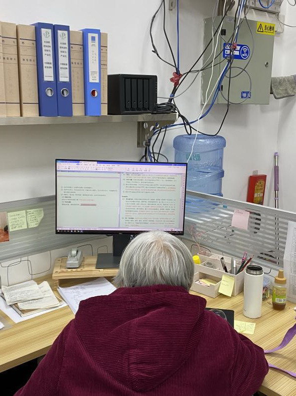 在秘书工位上修改论文的钟本和教授
