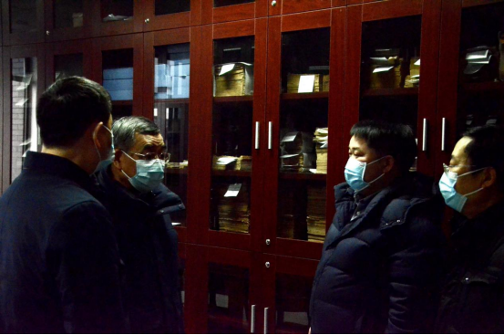 党委书记古立峰(左一)、院长李怡(右一)、副院长罗鹭(右二)参观“杨明照古籍特藏室”