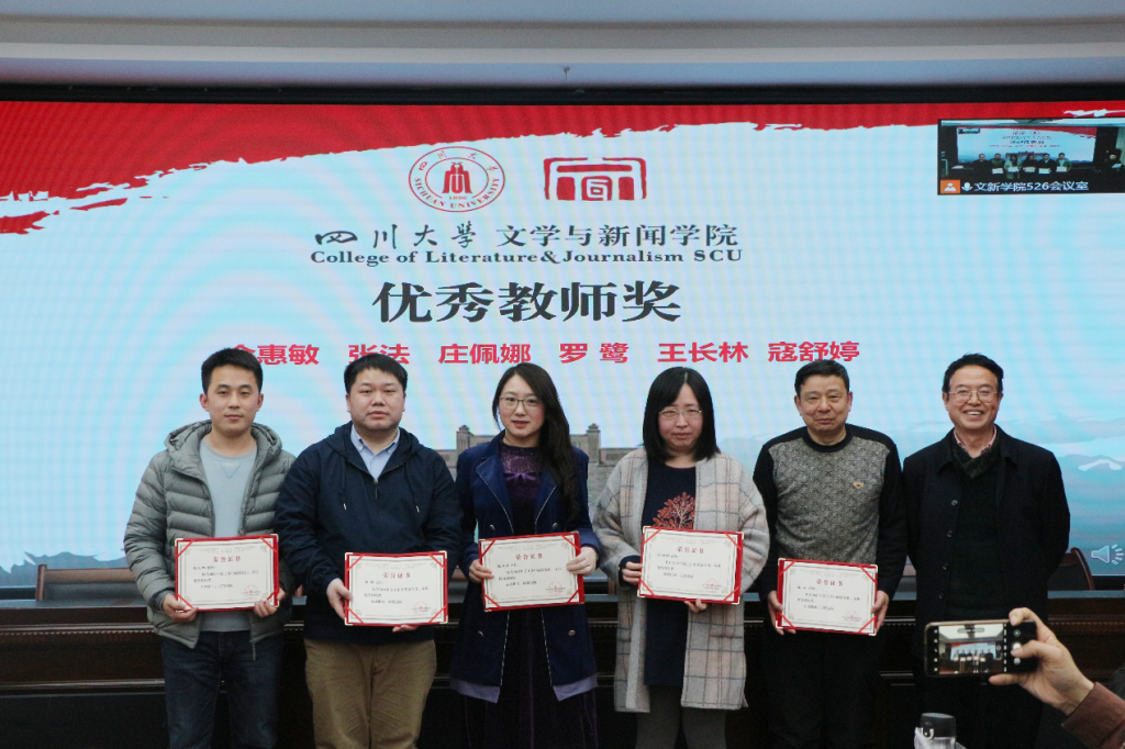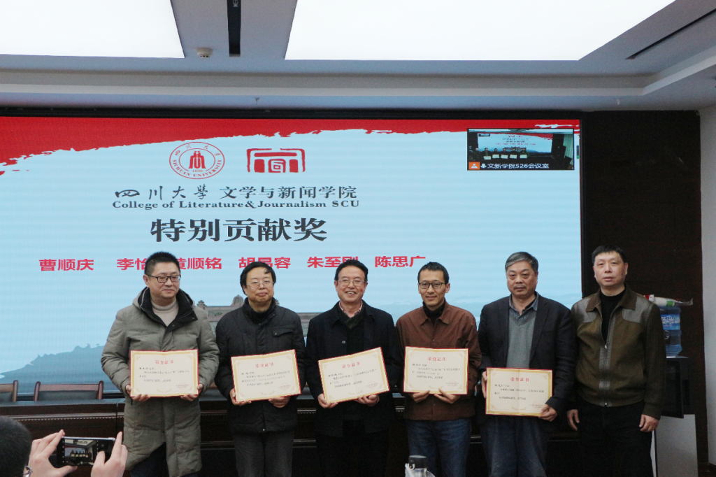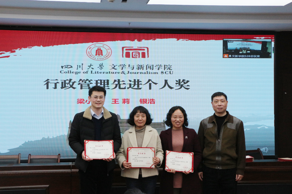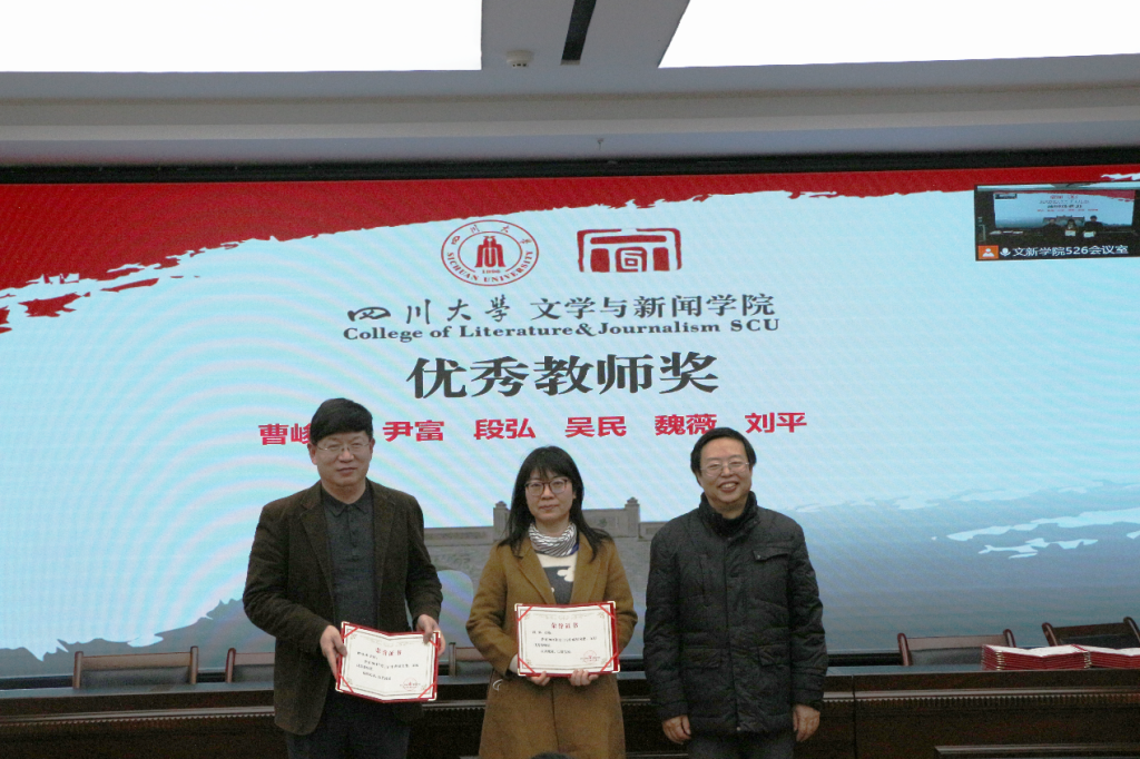 对各项工作表彰的获奖名单并说明了评奖原则。在欢快热烈的音乐中,古立峰书记、李怡院长与学术院长曹顺庆教授共同为樱花文学