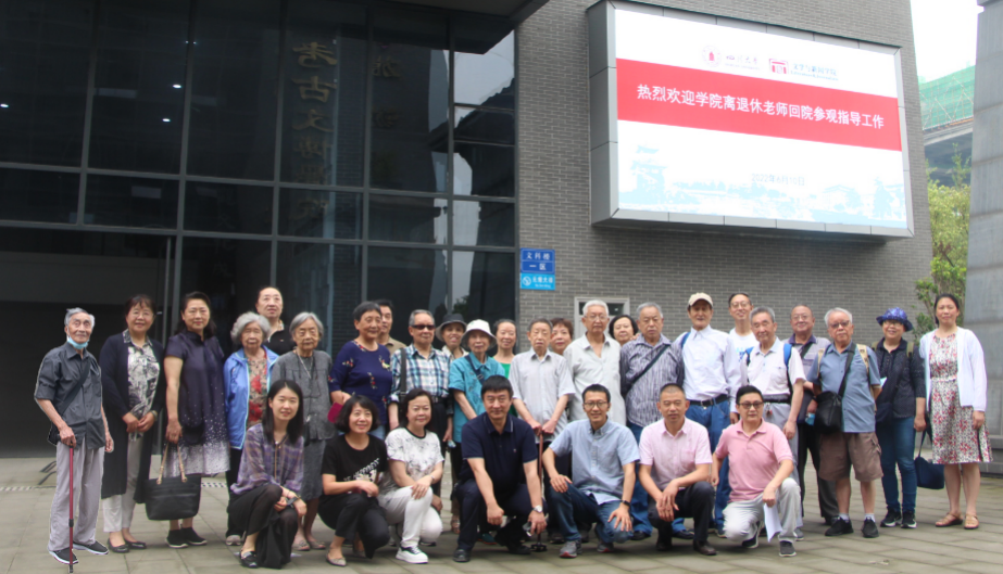 部分离退休教职工集体乘车到达江安校区文科楼一区,学院工会及党政办老师代表学院热情欢迎,大家在文科楼前合影留念。樱花文学