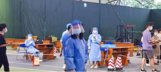 教师党员在江安校区网球场核酸检测点工作现场