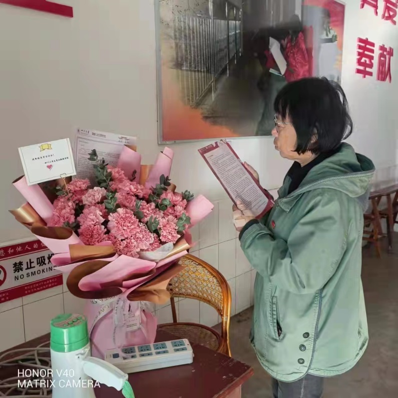 七一勋章获得者、全国优秀共产党员,云南丽江华坪女子高级中学书记、校长张桂梅收到学院慰问的鲜花并阅读学院江姐班的三八节慰问信