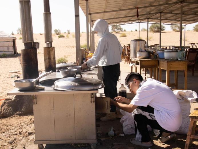 解决了燃料问题之后,如何烧火、如何做几十个人的大锅饭又成为了新问题。每个治沙队成员从一开始面对着灶台的不知所措、面面相觑到全体治沙队成员协力合作、游刃有余地完成色香味俱全的红烧牛肉、大盘鸡、可乐鸡翅。十四天的沙漠做饭生活,让治沙队成员习惯了在酷暑和灶台双重炙烤下做出可口的饭菜;让治沙队成员养成了拿到碗筷时吹走沙子然后会心一笑的习惯;让治沙队成员学会如何在沙尘暴即将席卷之际从容应对尚未煮完的饭菜。而每天结束植树育苗的实践劳动后,伴着夕阳吃到自己做出的饭菜是全体治沙队成员一天最大的慰藉。