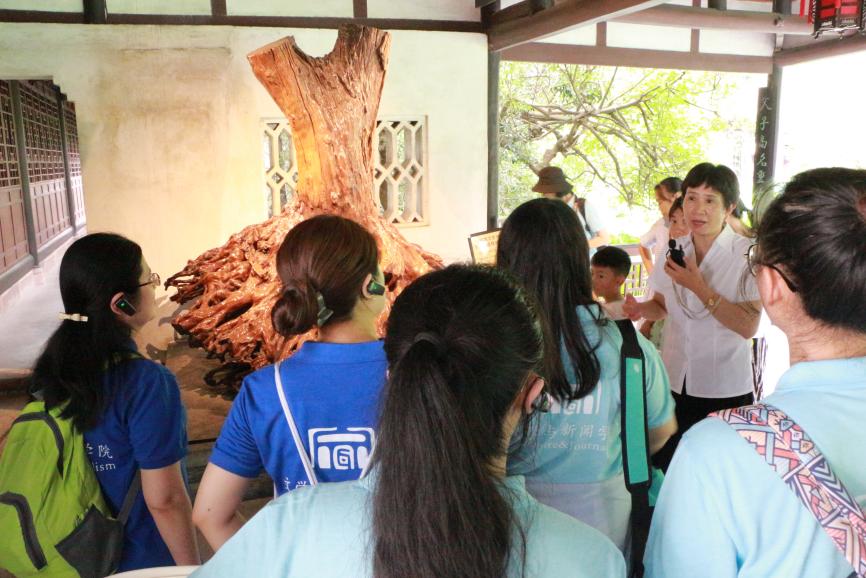 在三苏祠博物馆副研究馆员、文物部主任徐丽的带领下,师生们首先自南向北参观了门厅、飨殿、启贤堂等处,学习了名联名匾以及苏宅丹荔、古井等遗存的来历、意涵及背后典故。担任讲解工作的徐丽老师已经在三苏祠服务了四十年,期间还出版了《苏祠漫步》《名人与三苏祠》等著作,如今临近退休仍坚守在讲解一线,2022年习近平总书记考察三苏祠时便是由她负责讲解。据徐丽老师介绍,此次暑期社会实践的参观路线正好与去年相同。她广博的知识储备和生动的讲解方式不仅让师生们增加了对三苏文化的了解,还引发大家的探讨兴趣,不少师生自发地就相关文物和遗存抛出问题,并积极交流各自看法。