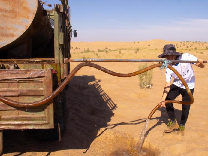 “川梭”公益植树治沙队成员给刚种下的梭梭苗浇水