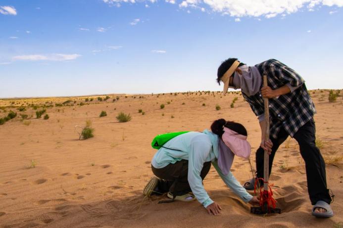“川梭”公益植树治沙队怀揣着“直到风沙止步”的决心来到位于腾格里沙漠腹地的武威市民勤县博龙沙产业开发有限公司东湖镇青土井沙产业示范基地,开展为期十四天的公益植树治沙实践活动。面对沙漠的恶劣环境,除了植树育苗工作,治沙团队还要学习沙漠生火做饭的技能。艰苦奋战的十四天里,无数次掀起不知道深浅的细沙、无数次与下渗的沙土竞赛、无数次弯腰……治沙队成员与其他高校治沙队一同种下近8000簇树苗。