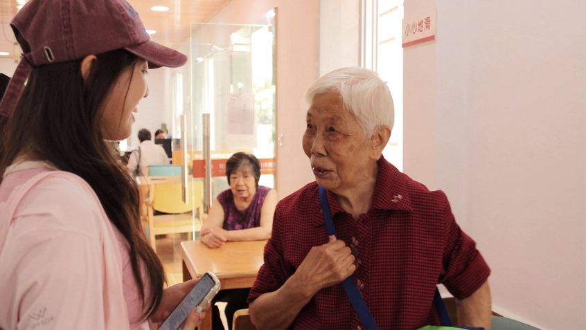 “颐食无忧”社会实践团队队员与就餐老人交谈