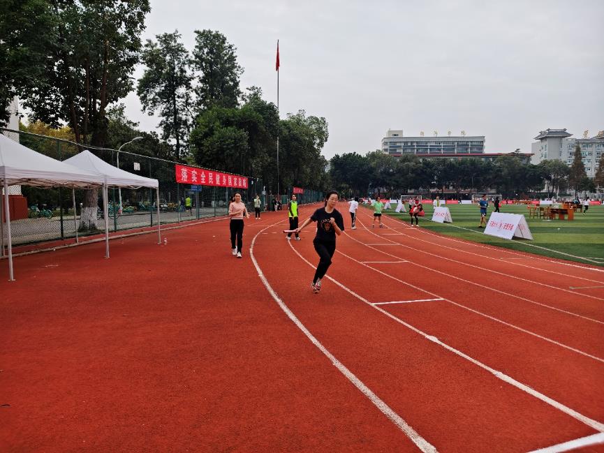文新大家庭,风采第一名。学院组织教职工参与了所有集体项目,抛球入筐、青年组和中年组绕杆踢球射门、12×60 米 接力、毛毛虫竞速、男子 4×100 米接力、女子 4×100 米接力、男女混合跳绳、拔河等,也参与了大多数个人项目,如女子 100 米、女子跳远、男子实心球、女子实心球、女子铅球等,比赛拼力,助威声喧,经过众多学院老师的激烈比拼,贺碧霄、刘娜、陈羲、高小珺四位老师荣获女子 4×100 米第九名、贺碧霄老师荣获女子跳远第一名、高小珺老师荣获女子100米第十三名的好成绩。组织的、动员的、参赛的、服务的、助威的,往来穿梭,青春洋溢,大家齐心协力,通力配合,运动会成为欢乐的集体盛会。