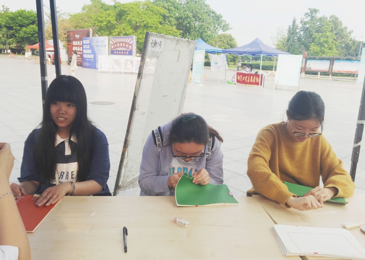“同学们来摊位做书真正学到了线装书怎么做,大家对书籍装帧也非常感兴趣!愿意认真听我们讲解。”社长曹思思全程投入活动之中,感叹道:“这次活动的初衷之一就是想在同学们中间普及中国古代书籍装帧设计,让存在于历史深处的线装书成为我们身边的平常。”