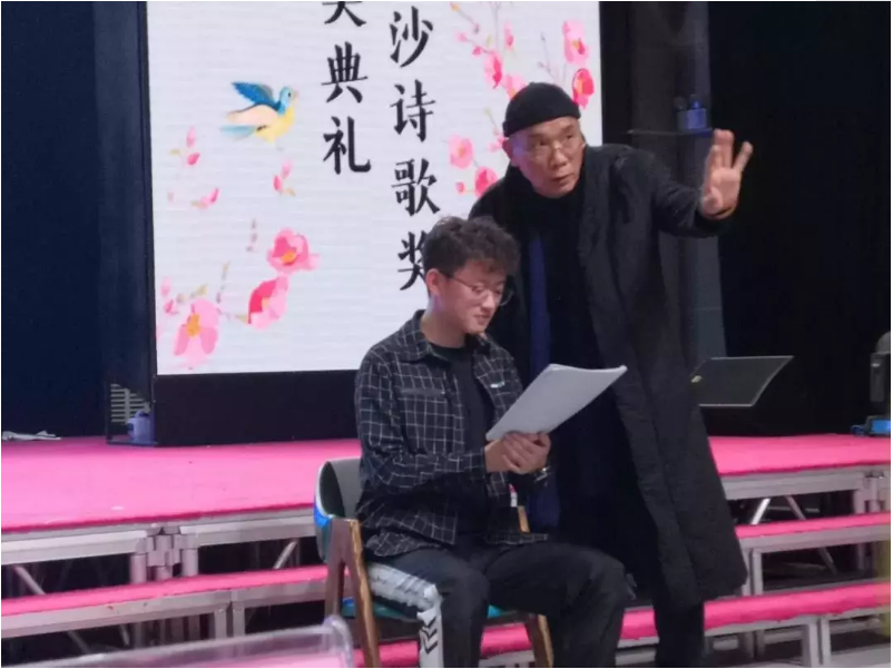 春天诗会暨首届金沙诗歌颁奖典礼上,方旭老师身着便服表演了话剧片段《我这一辈子》。即便无布景无道具,他也凭借一只话筒、简单的肢体语言和深厚的台词功底,将该片段中的巡警形象展现得淋漓尽致。