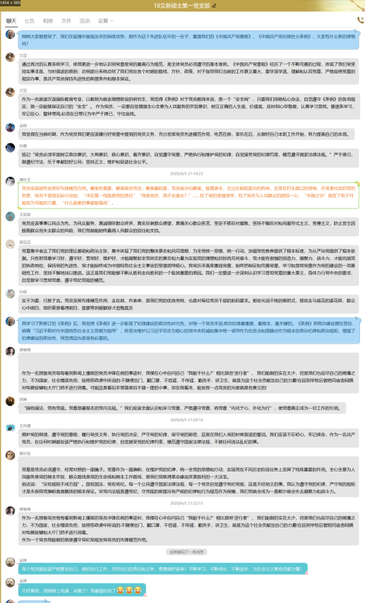 2018级硕士第一党支部支部书记刘伊辛向党员们介绍了本次党会的两项内容:一是“共抗疫情、爱国力行”主题座谈会;二是党内法规专题学习会。刘伊辛书记组织党员们观看了抗疫视频《决胜:为人民而战》,学习抗疫先进事迹和典型人物,随后各位党员在线上发表自己的心得体会。二是党内法规专题学习会,学习会采用自学与集中学习两种形式。会前,各同志自学了《中国共产党章程》、《中国共产党纪律处分条例》。会上,支部书记刘伊辛带领大家全面学习了解《中国共产党纪律处分条例》的修订背景、新旧内容对照和修订意义,逐条解读新《条例》。与会党员对《条例》修订后的内容进行了深入学习。在此基础上,支部党员们交流了自己的学习体会。