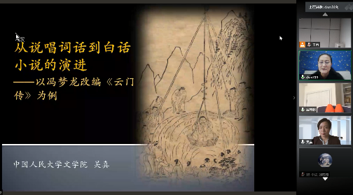 2020年10月15日下午3:30,中国人民大学文学院吴真教授应邀作题为“从说唱词话到白话小说的演进——以冯梦龙改编《云门传》为例”的在线主题讲座。樱花文学