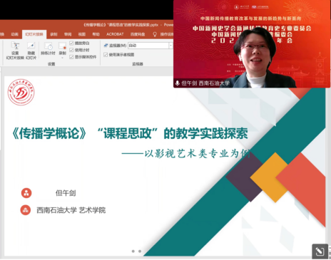 西南石油大学艺术学院副教授但午剑作了题为《〈传播学概论〉“课程思政”的数字实践探索—以影视艺术类专业为例》的主题报告。她结合自身的教学实践,讲解了如何让学生在《传播学概论》的主动学习过程中,潜移默化地接受价值引领:在教材选用上,要兼顾课程思政和专业特点;在教学内容设计上,要深度挖掘价值引领与专业知识、能力的内在联系;在教学方法设计上,坚持学为主体、教为主导,注重提升学生的学习兴趣和主动性;在思政效果考核上,将过程性评价和终结性评价相结合。