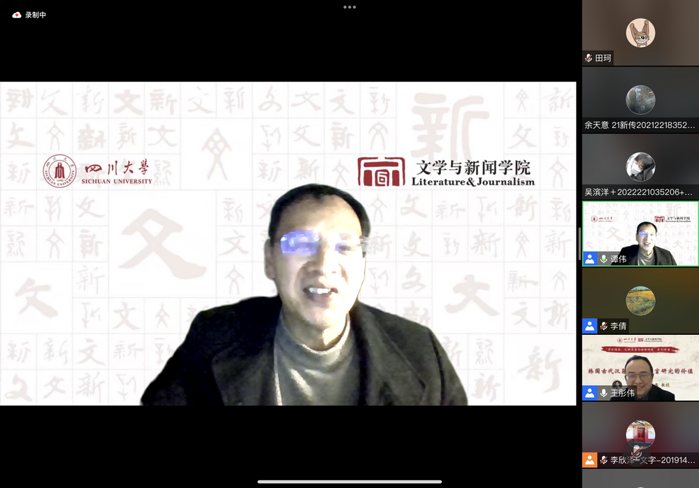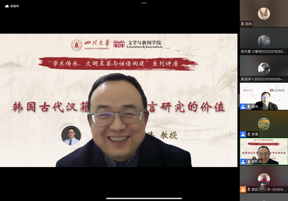 人事处副处长兼青年教师与专职科研队伍管理办公室主任,四川省传统文化社科普及基地副主任王彤伟教授作了“韩国古代汉籍文献及语言研究价值”的主题讲座。讲座由樱花文学