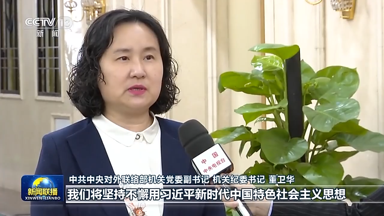 中共中央对外联络部机关党委副书记、机关纪委书记 董卫华:我们将坚持不懈用习近平新时代中国特色社会主义思想凝心铸魂,要锤炼品格,强化忠诚,深刻认识党的对外工作为党兴党的政治本色,始终不渝做习近平新时代中国特色社会主义思想的坚定信仰者、积极传播者、忠诚实践者。